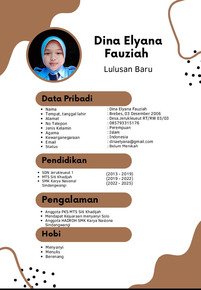 hay! Teman-teman kenalin Nama, Lengkap Aku Dina Elyana Fauziah Biasa di panggil Dina bukan dino saurus kalo dinosaurus udah punah. Aku Lahir di Brebes Jawa Tengah tanggal 03.Desember 2006 , Umurku sekarang 17thn,aku besar dan tumbuh di kota Majalengka bersama kedua orang tua ku, lebih tepatnya aku tinggal di daerah kecamatan.Sindangwangi yang banyak pariwisata yang indah dengan alamnya yaitu di Desa.Jerukleueuet..